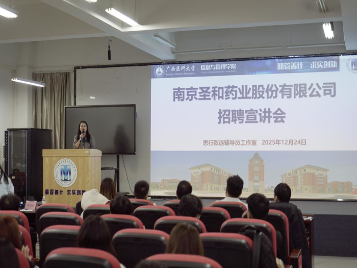 为精准对接企业需求、助力毕业生就业,2025年12月25日,古天乐太阳集团城在武鸣校区A8-1-301报告厅举办南京圣和药业股份有限公司专场招聘宣讲会。公司党委副书记蒋鹏、员工工作办公室何锡嘉、毕业生辅导员谭艳红、南京圣和药业股份有限公司总经理童川一行及全体2026届本科毕业生参加本次活动。